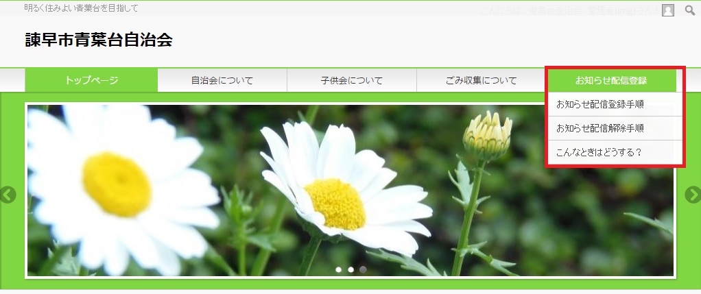 「お知らせ配信登録」へ赤枠線内の項目をメニューに追加しました。